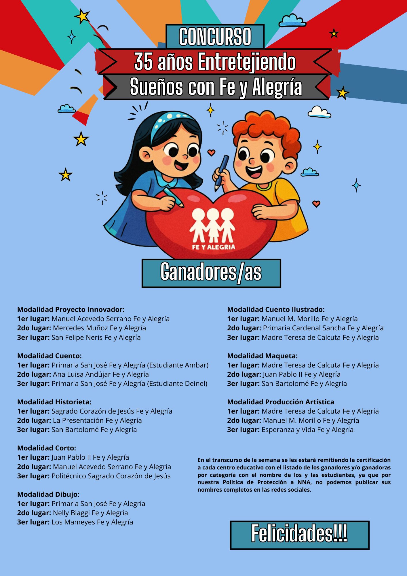 En el transcurso de la semana se les estará remitiendo la certificación oficial a cada uno de nuestros centros con el listado de los ganadores y/o ganadoras por categoría con el nombre de los y las estudiantes ya que por nuestra Política de Protección a NNA, no podemos publicar sus nombres completos en las redes sociales.